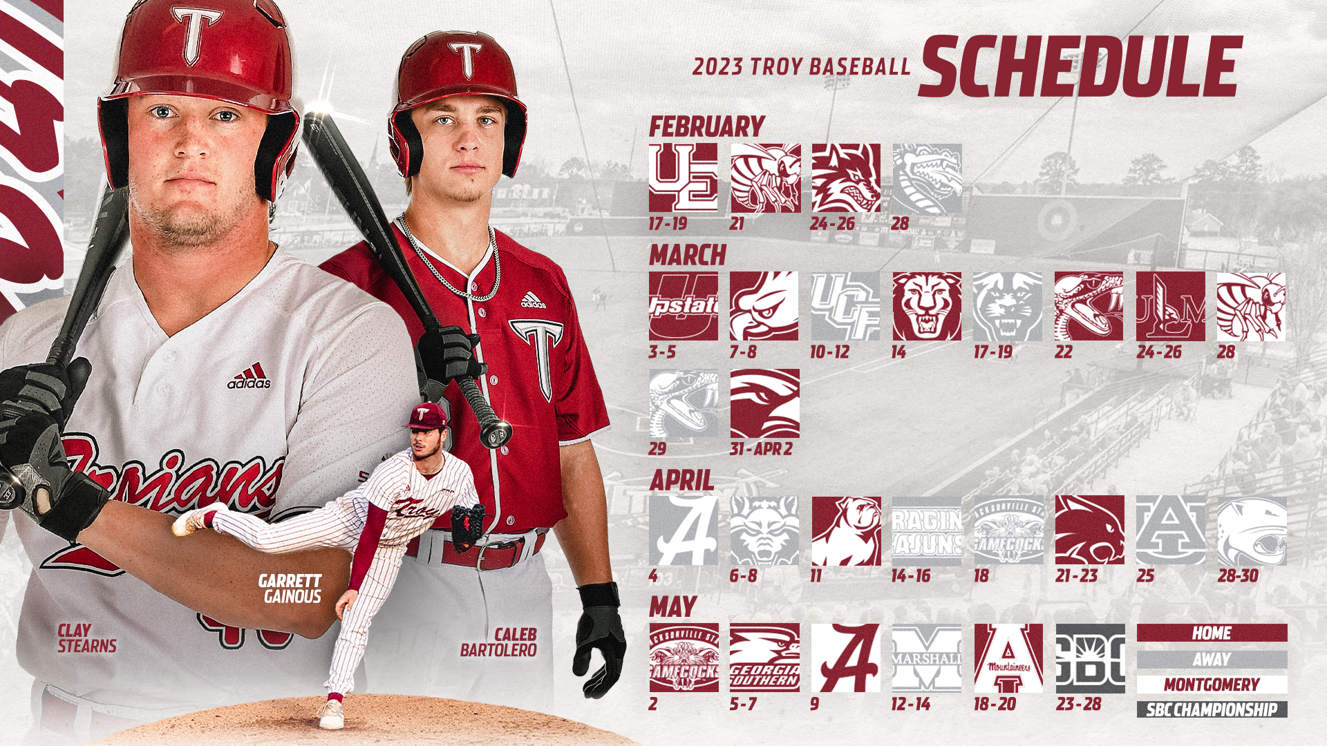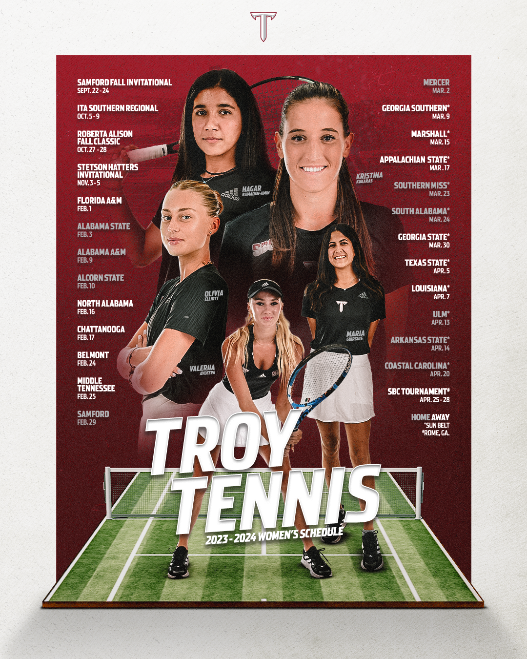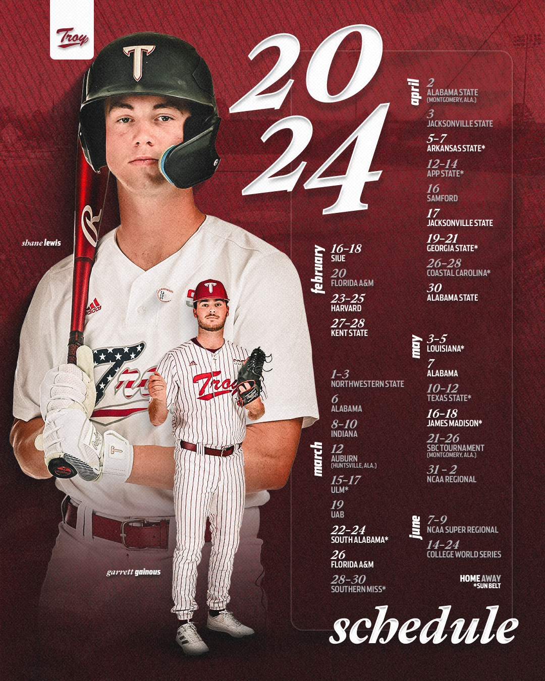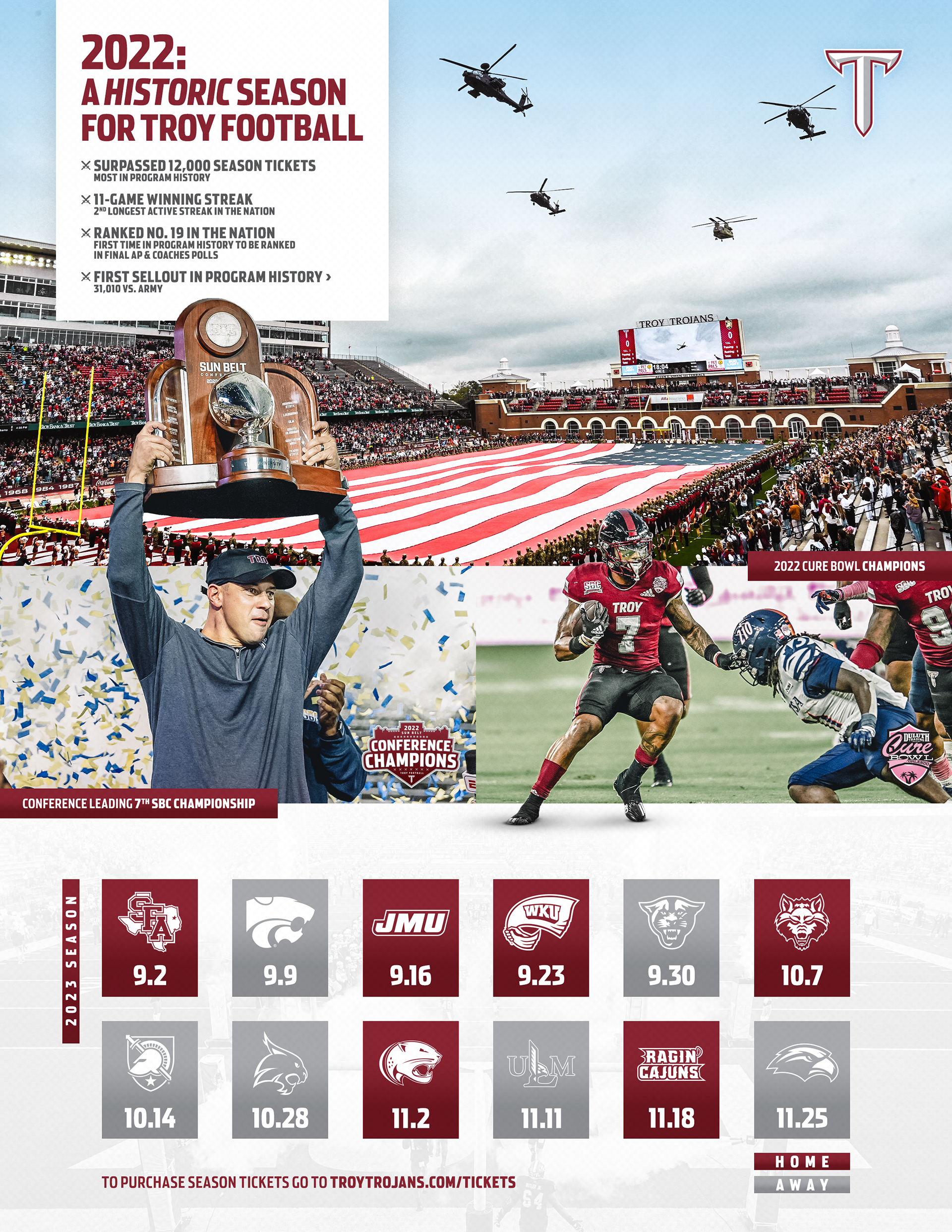 Various graphics for Troy University Athletics during the 2022-2023 and 2023-2024 seasons